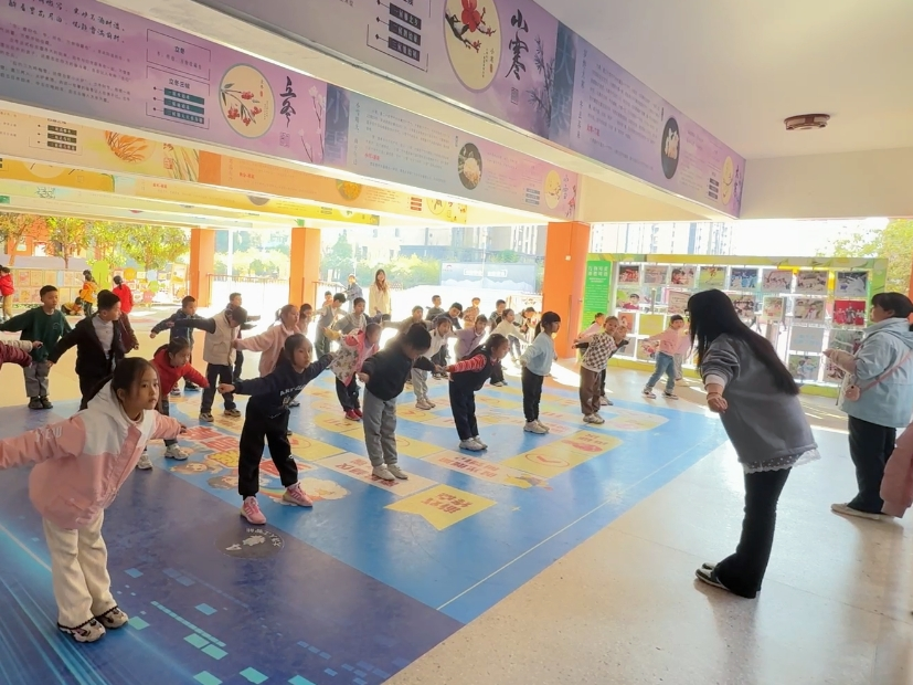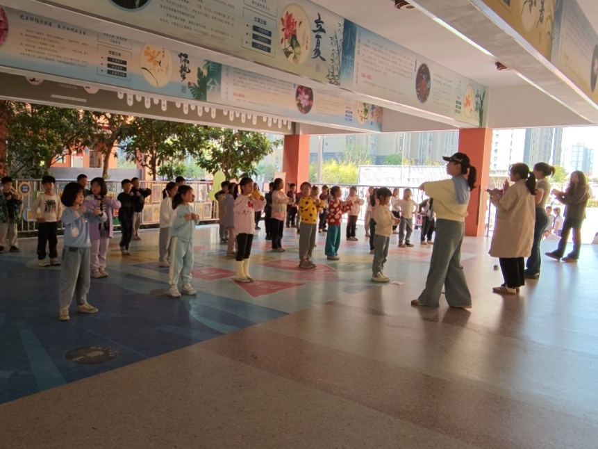 活动伊始,龚乃云率志愿者团队进入小学。面对活泼好动的孩子们,龚老师率先以生动亲和的方式向孩子们阐释武术文化精髓,同时引导志愿者实现专业理论与教学实践深度对接。音乐教育组发挥节奏旋律把控专长,为龙拳注入韵律基因;学前教育组运用儿童行为引导技巧,拆解招式、分步示范。从武术的基本动作握拳、踢腿到连贯的龙拳动作,师生协同开展精准化纠偏,见证孩子们从生涩模仿到形神兼备的蜕变历程。