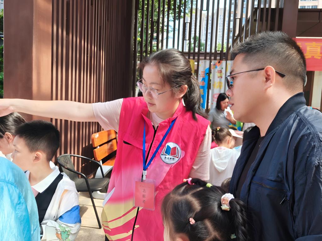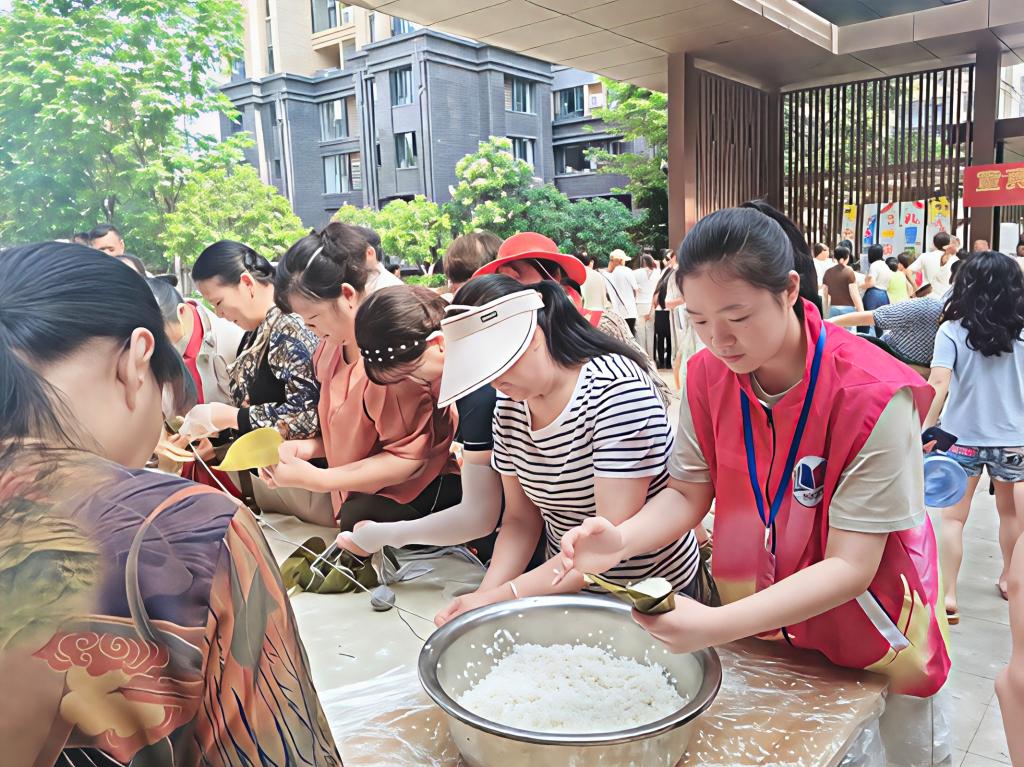 在端午趣味互动区,志愿者们分工协作,维持包粽子比赛的秩序,协助分发材料、计时评分,并贴心提醒家长注意儿童安全。投壶游戏环节中,他们化身“游戏裁判”,统计得分并发放艾草香包等小礼品,现场欢声笑语不断。此外,志愿者们还协助美食分享区的布置,引导居民围坐交流,并协助展示业主创作的端午诗词作品,为邻里互动搭建温馨平台。