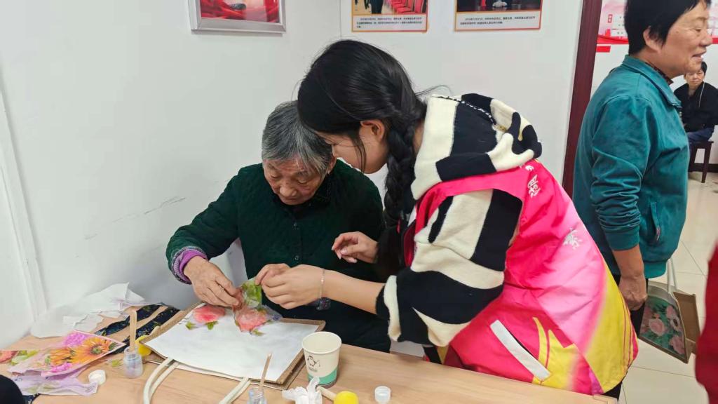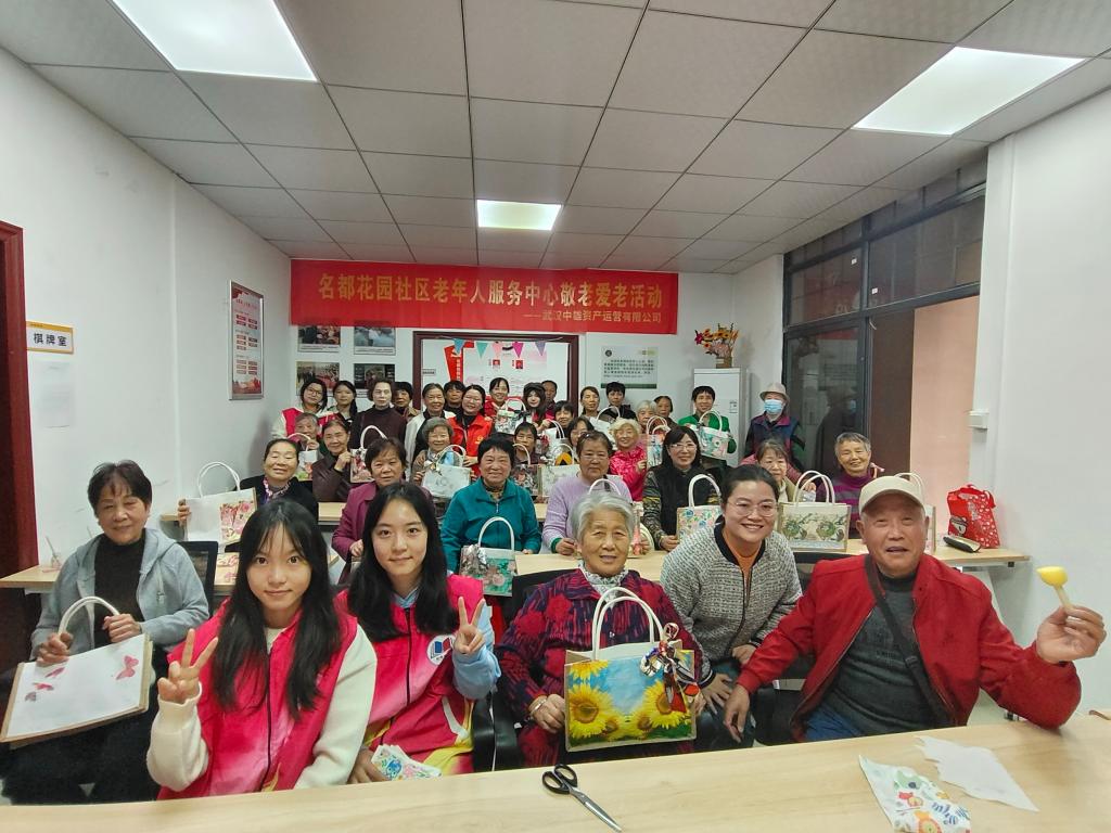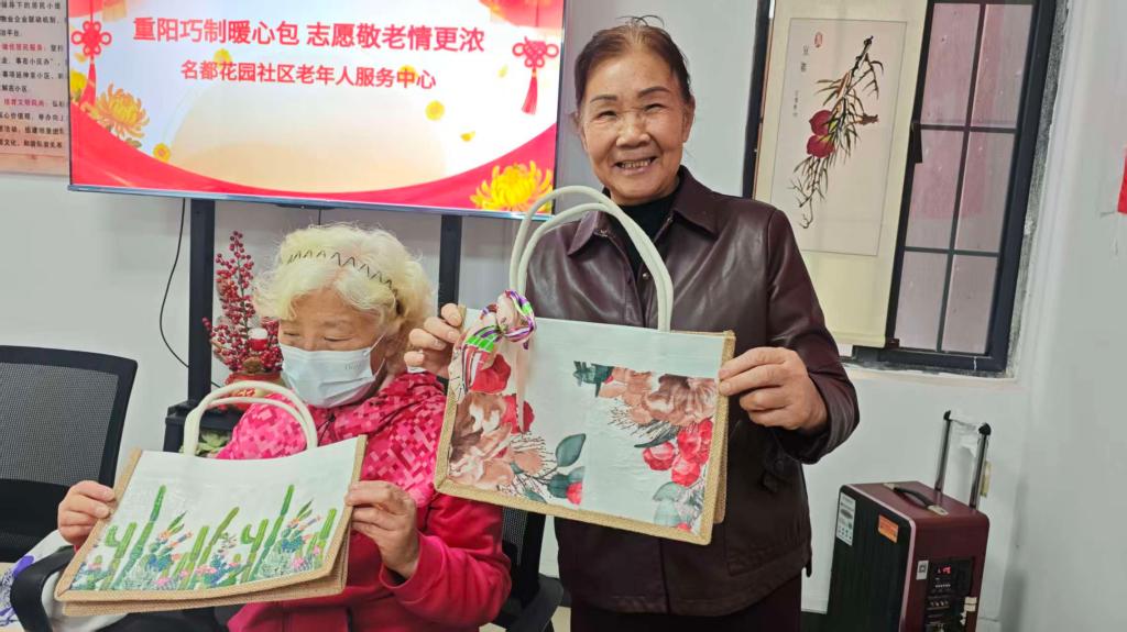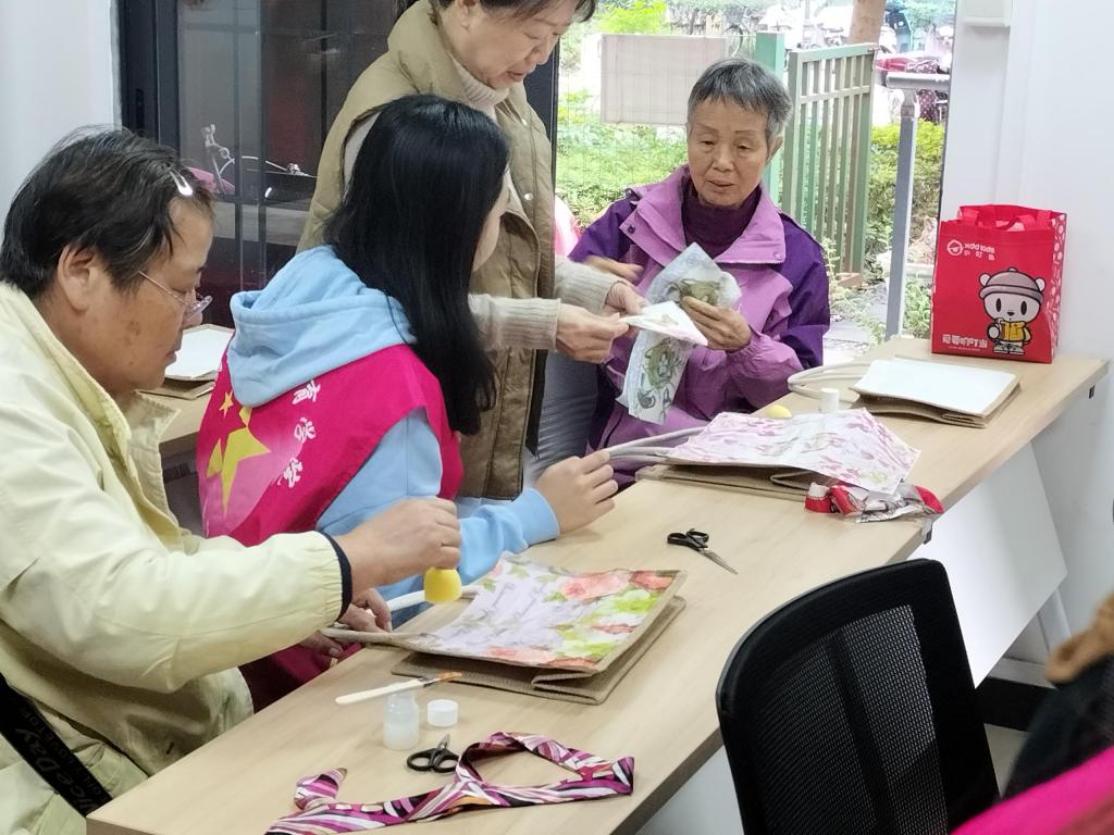伴随着“岁岁又重阳,福寿安康乐无边”的诚挚祝福,志愿者们详细讲解了“蝶古巴特”手提袋的制作技巧。在志愿者的悉心指导下,老人们动手将各色图案精心拼贴,原本朴素的手提袋渐渐变得精巧别致、色彩纷呈。大家互相欣赏着彼此的作品,脸上洋溢着满足与欢欣。