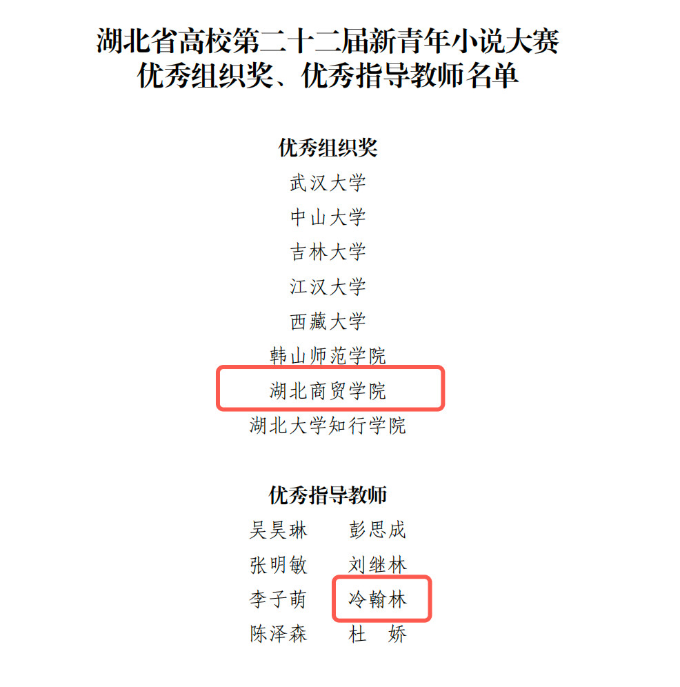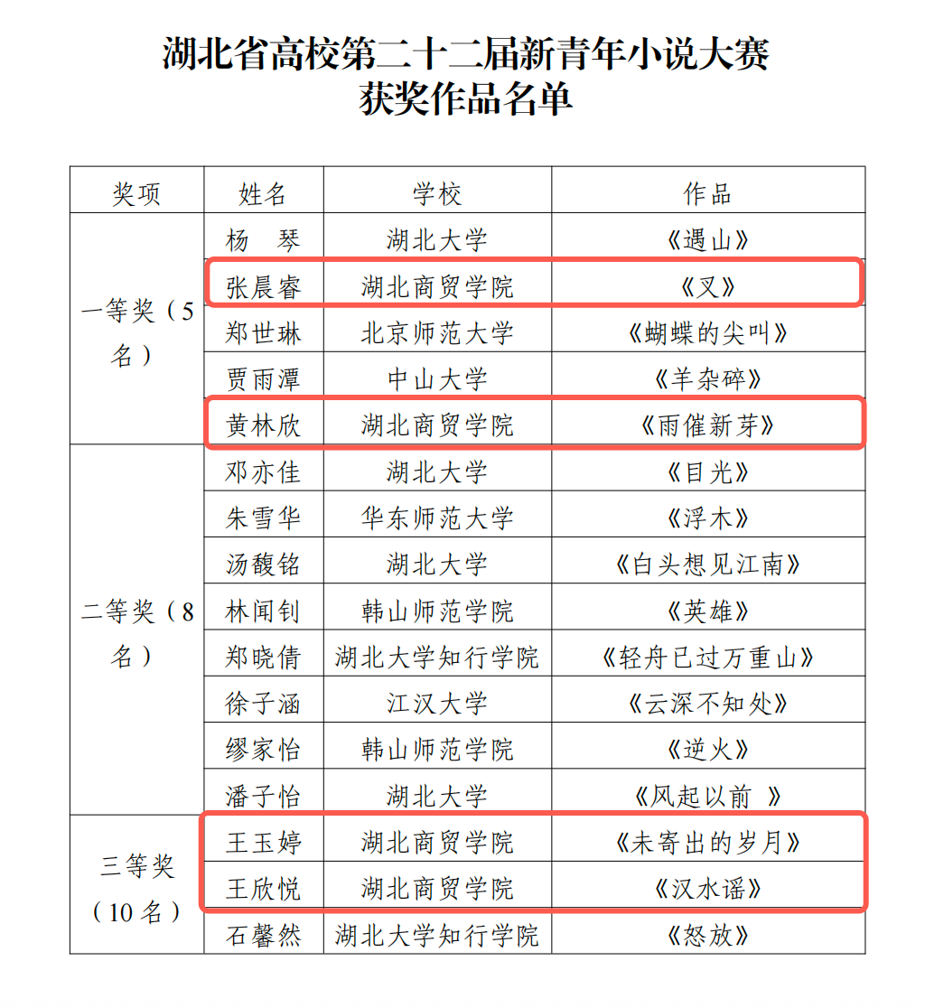 近日,从湖北省高校第二十二届新青年小说大赛组委会传来捷报,我校师生在此项省级文学盛事中表现卓越,成绩斐然,一举揽获多个奖项,充分彰显了我校人文教育的丰硕成果和学子们的卓越风采。