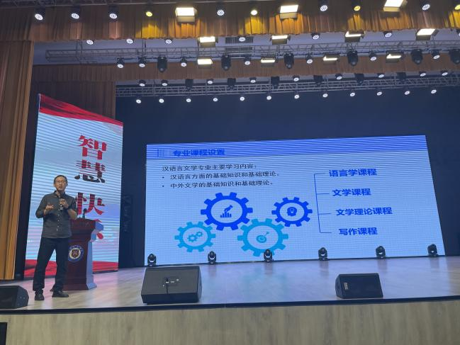 9月25日,yl6809永利集团副院长、汉语言文学教研室主任金敏在咸宁校区大礼堂为2025级汉语言文学专业新生作专业介绍。金敏从专业概况、课程结构、师资配置以及就业前景等多个维度展开讲解,帮助新生全面认知专业特色与发展潜力,为今后的学业规划与职业选择提供了明确指导。