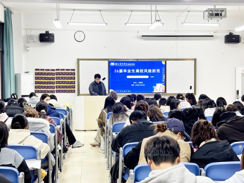 为切实保障2026届毕业班学生顺利离校开展实习、就业工作,强化学生安全防范意识与权益保护能力,10月28日至30日,yl6809永利集团辅导员张香湘、颜世超分别面向所带毕业班学生,陆续开展离校安全教育主题班会,为即将踏上人生新征程的学子们送上“安全锦囊”与暖心关怀。