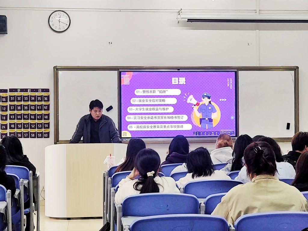 本次系列班会以“风险防范+权益维护+离校规范”为核心,内容全面且贴合毕业生实际需求。在求职安全板块,辅导员详细拆解了试用期陷阱、虚假就业信息、协议霸王条款等六大求职“雷区”,结合《中华人民共和国劳动法》相关规定,明确告知学生同一用人单位只能约定一次试用期、严禁用人单位收取保证金等关键要点,并传授“望闻问切”四字甄别法,引导学生通过正规渠道核实企业资质,警惕“境外高薪”“无经验高报酬”等虚假招聘诱惑。
