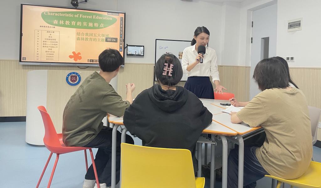 陈璐瑶老师展示的是《德国幼儿园课程途径与实施——森林教育》,她通过案例导入引导学生初步感受森林幼儿园。在整个教学中陈老师以小组竞赛的形式开展,充分调动学生的活跃度,学生参与积极,如在理解森林教育的定义时,陈老师通过填空练习、互动回答等小组竞赛法帮助学生充分理解了概念;在概括森林教育实施特点时,她通过两两分享的方式,引导学生自主讨论总结出知识要点。最后她落脚学生的现实生活,引导学生根据“森林教育活动一览表”设计武汉幼儿园在东湖水杉林森林日活动。