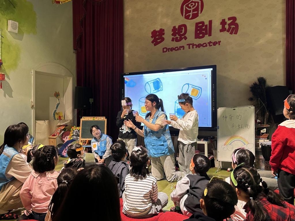 下午专场活动中,我校志愿者方卓担任主讲,宋金月、龙莹等同学担任助教。活动通过太阳公公找回好朋友彩虹雨为故事主线,带领孩子一步步剖析彩虹雨的原理,最后掌握制作彩虹雨的方法。在志愿者带领下,小朋友们戴上了科学家头饰,进入了科学世界。志愿者们运用情景剧、实验法,将绘本内容与情境结合起来,让幼儿通过情境加深绘本内容理解。在观察“会说话的彩虹雨”照片过程中,探索彩虹雨实验的操作步骤,鼓励孩子们观察实验现象,动手制作自己的彩虹雨。在愉快的歌声中,活动圆满结束。