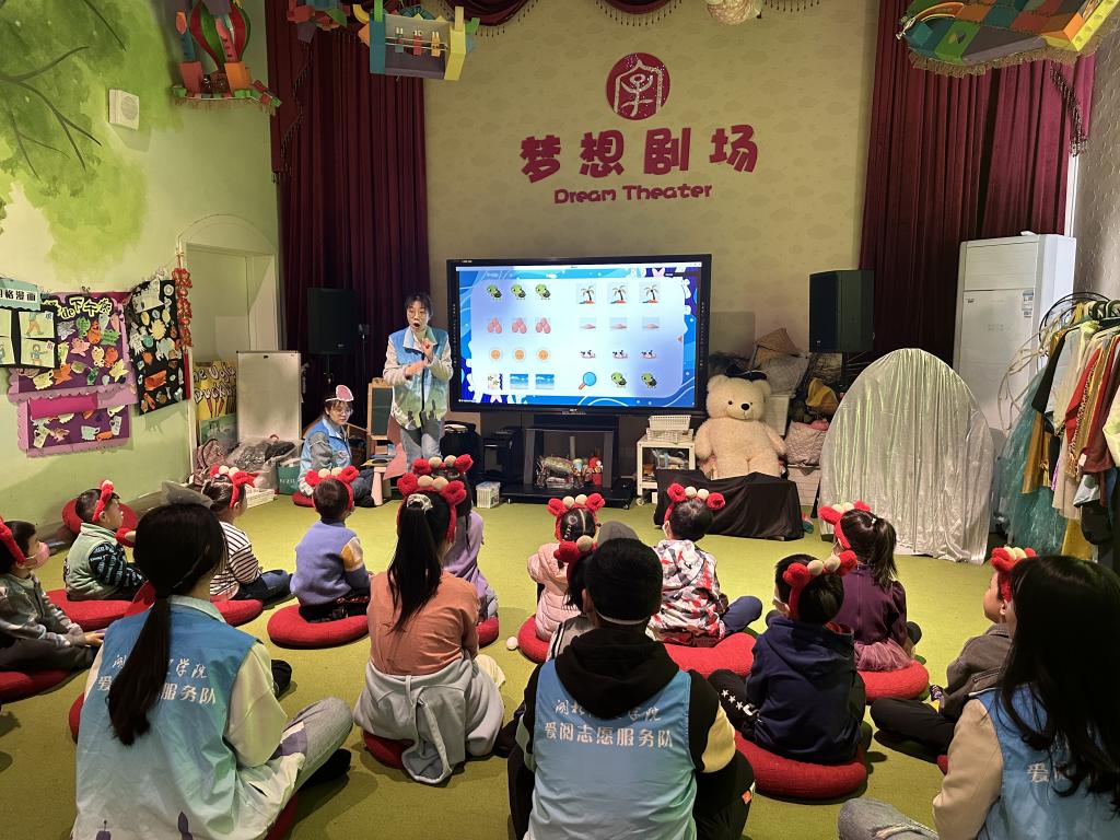 上午专场活动中,我校志愿者李妤霜担任主讲,胡璨、陈鑫雨、曾祎狄等同学担任助教。在志愿者们的带领下,小朋友们戴上了螃蟹发卡,进入了“海洋世界”。志愿者们运用奥尔夫音乐教学方法,将图片内容、大小与童谣