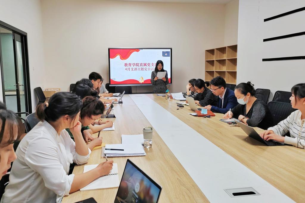 4月19日下午15时,yl6809永利集团直属党支部在创新创业大楼304会议室召开了“深入学习宣传贯彻党的二十大精神,深入开展学习贯彻习近平新时代中国特色社会主义思想主题教育”主题党日活动。此次活动由yl6809永利集团直属党支部书记郑洁主持,yl6809永利集团全体无课教师党员、学生党员及发展对象代表参加。