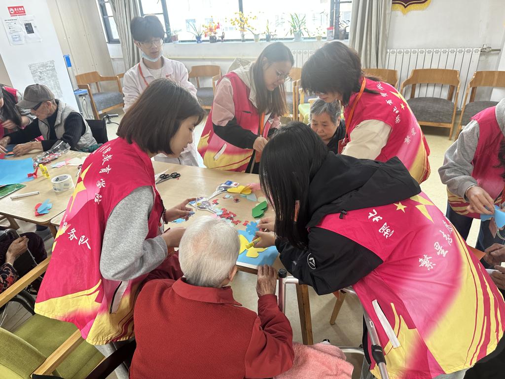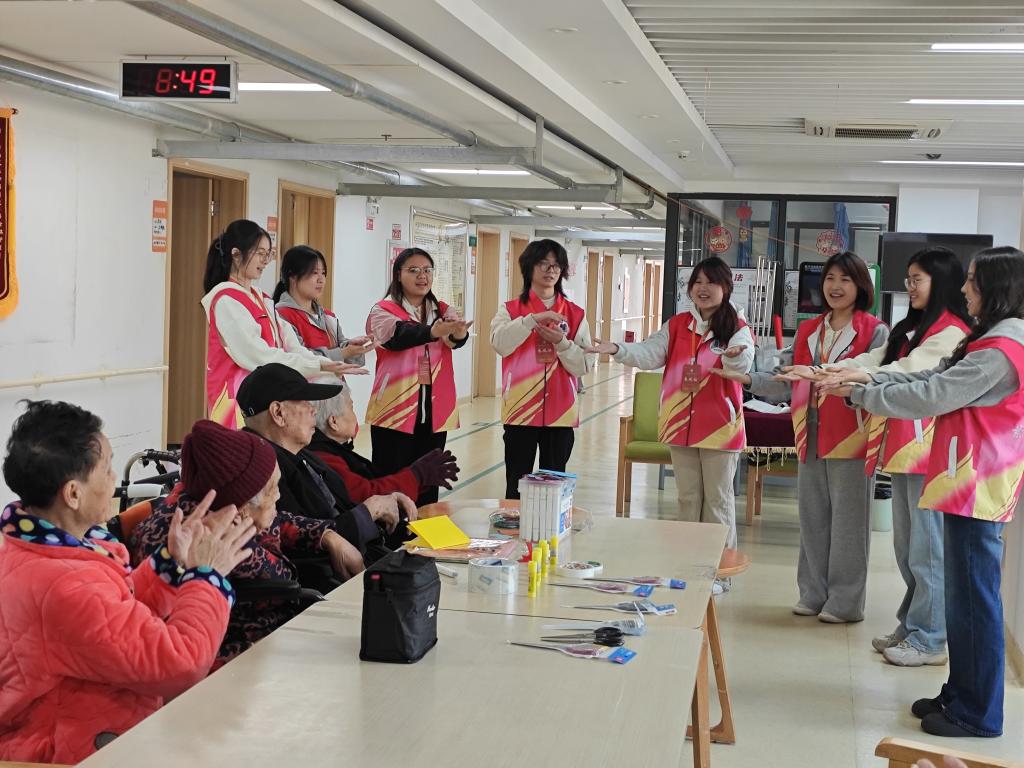 活动内容包括“茉莉花”手势舞表演、蝴蝶剪纸粘贴画及“床边慰问”等环节。在志愿者的有序组织与耐心协助下,各项活动顺利开展。优美的手势舞表演赢得阵阵掌声,剪纸粘贴画环节中,老人们与志愿者携手合作,笑语不断,画面温馨而动人。这些互动不仅拉近了彼此的距离,更在潜移默化中促进了两代人之间的情感交流与心灵契合。整场活动在欢声笑语与浓浓暖意中圆满落幕,为福利院的老人们带来了关怀与陪伴。