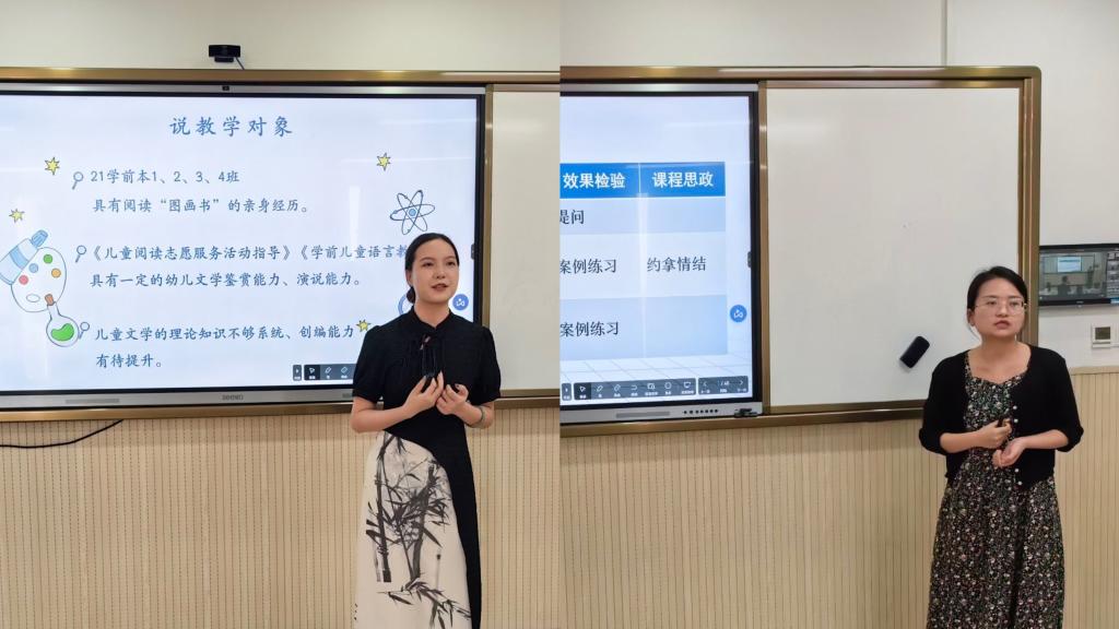 在第二天的磨课活动中,张俊南以电视剧片段“小欢喜”作为《教育心理学》这门课程的导入,通过分组讨论,引导学生比较人本主义和行为主义、认知主义的区别。汪洁通过讲解“昭君出塞”故事的人物和发展背景,引导学生总结故事讲述的五个特点,帮助学生梳理故事的脉络。邓舒予从00后童年影视、童年游戏和童年读物的话题出发,全场积极参与,互动热烈,根据案例分析图画书的五大作用,体会儿童文学的魅力。廖彦泽生动形象总结新时代中小学教师职业行为十项准则所要求的能做与不能做的事情,课程设计开头和结尾相互照应,提升学生独立思考和合作交流的能力。