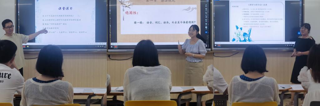张立营以赫尔巴特的名言作为导入,结合小学教育实际案例,将教育性教学原则、传统教育的三中心理论和四阶段教学理论等知识深入浅出地展现。而贾冰心也以名人事迹作为导入,讲解班级授课制的历史背景。用图片启发学生思考个别教学和班级授课的区别,引导学生总结班级授课制的特征。胡倩在讲授《教育学原理》时通过词源探究的方式,提炼出学校产生的三个基本条件,以思维导图的形式梳理学校的发展历程。陈璐瑶以“瑞士森林幼儿园”一课为例,利用灵活运用多样化的任务单,引导学生思考森林教育对我国的借鉴启示,并线上问卷检测学生知识掌握情况。方珞瑶以“我们学过汉语语法吗”作为问题导入,通过“猴子”“香蕉”“吃”三个词语的摆放序列,引导学生归纳语法的含义,并运用大量语言生活的案例,讲解语法的四个性质,激发学生的学习兴趣。