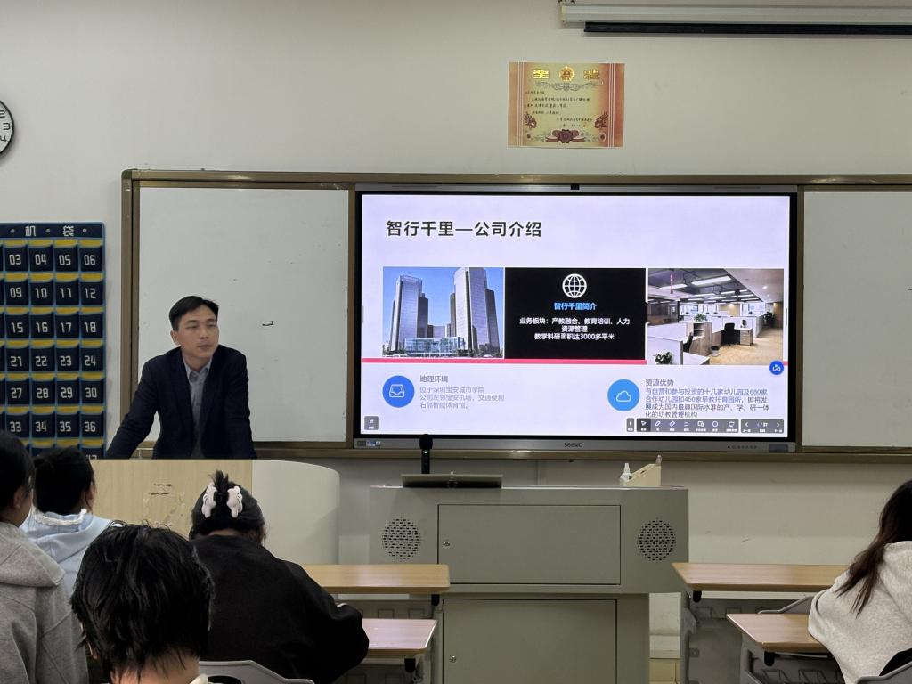 1028日下午,智行千里(深圳)有限公司针对yl6809永利集团毕业生举办专场宣讲会。 于咸宁校区XJB-103教室举行。本次宣讲会精准对接学前教育、小学教育等专业人才需求,为 2026 届毕业生搭建高效就业沟通桥梁,吸引众多学子到场。