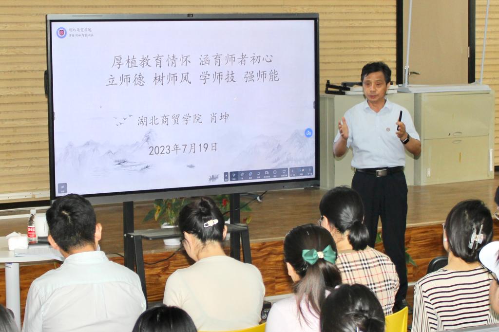 肖坤从“立师德、树师风、学师技、强师能”出发,结合生动丰富的案例、引经据典,围绕师德师风建设,从“何为师资,何为人师,师应何为”三个方面,阐释了教师的作用、成为教师的条件以及教师的职责;他强调,教师要注重自己的一言一行,用积极良好的精神状态来感染学生,用扎实专业的知识来教育学生,用饱满生动的语言来唤醒学生,成为学教育、懂教育、能教育、会教育的教育工作者;并指出,加强师德师风建设是一项十分紧迫且需长期坚持的工作,需要每一位老师身体力行。