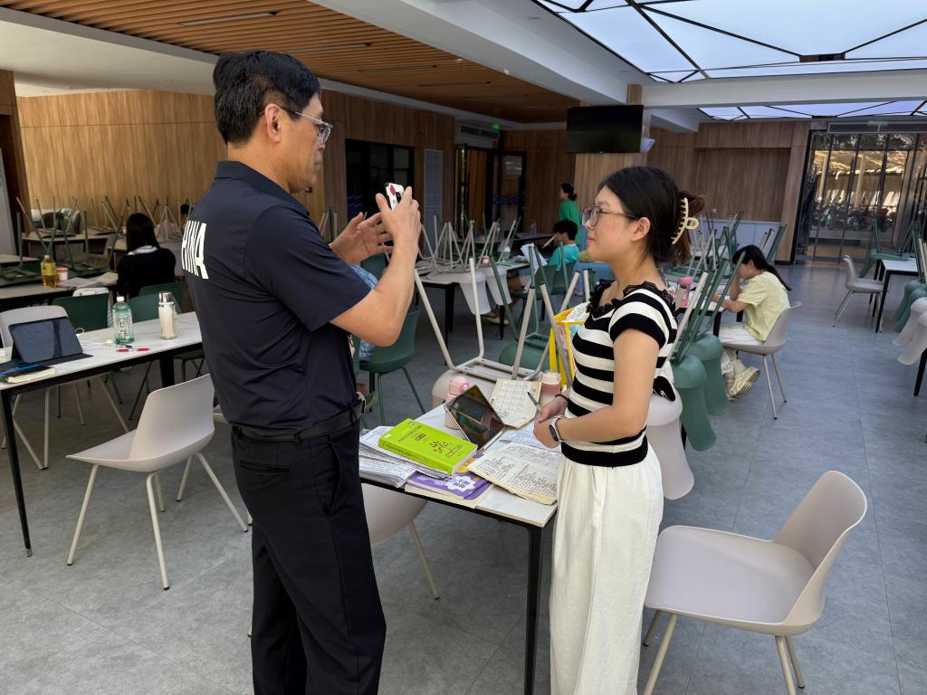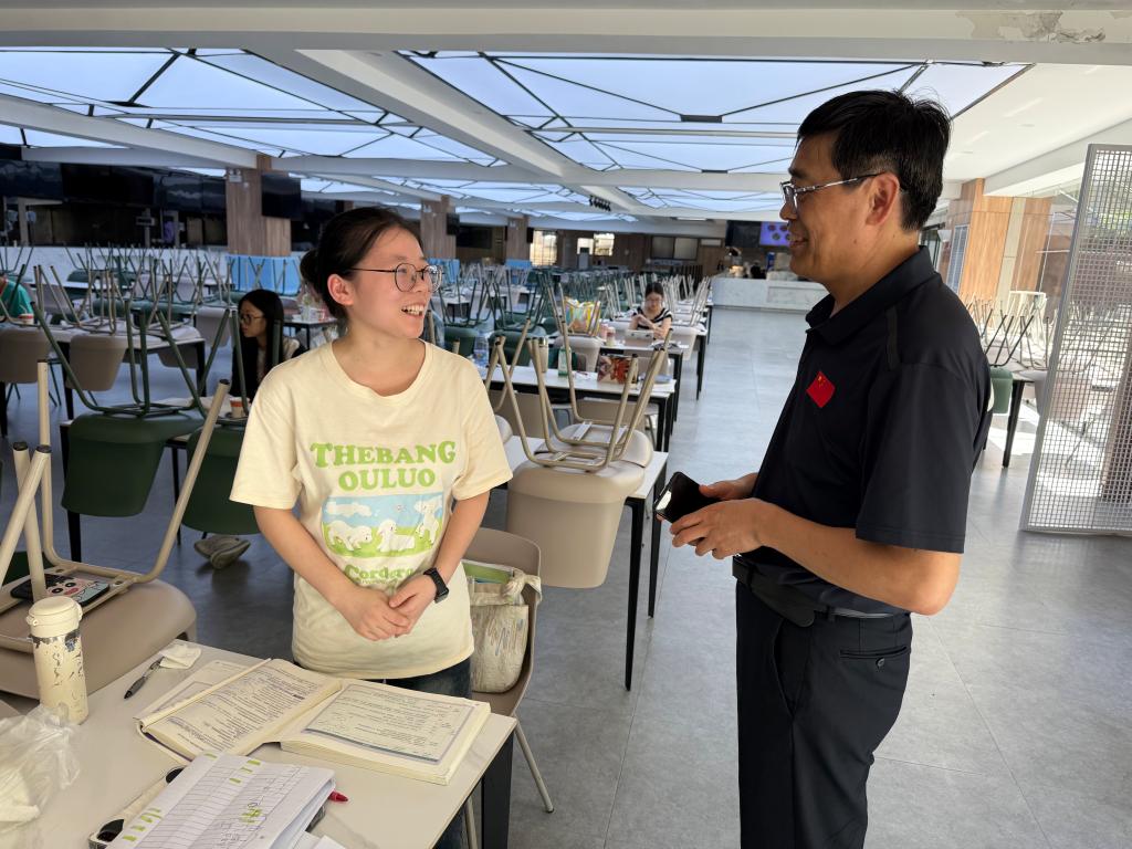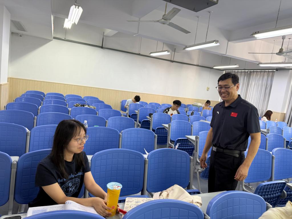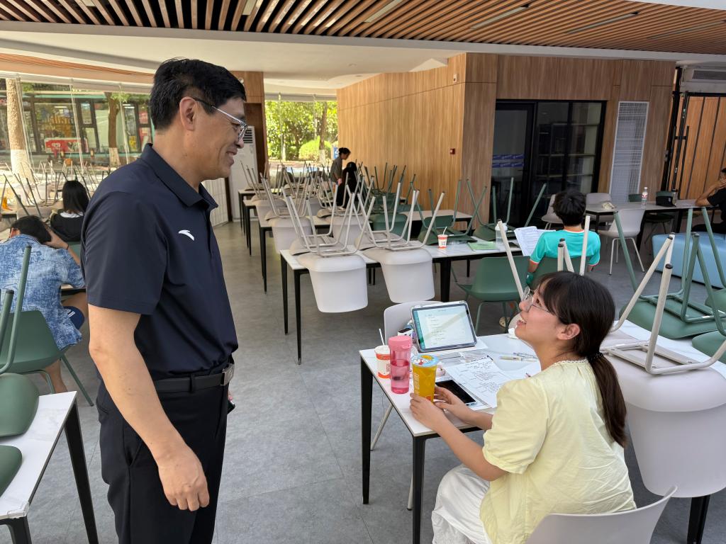 李保强一行轻步走入,细致观察学子们的学习状态与复习环境。李院长俯身与多位同学亲切交流,详细询问复习进度、学习计划、生活保障以及存在的实际困难。“天气炎热,大家留校复习辛苦了,一定要注意劳逸结合,保重身体。”李院长关切地叮嘱,并勉励大家一要科学规划,张弛有度,确保身心健康是高效学习的基础;二要坚定信念,心无旁骛,相信持之以恒的努力终将获得回报;三要善用资源,勇于求助,学院将不遗余力为大家排忧解难。学院将始终是大家的后勤部和服务站,确保大家安心复习。“看到你们目标明确、意志坚定,在酷暑中依然保持昂扬的斗志,这正是我们教院学子追求卓越精神的生动体现,学院以你们为荣!”李院长的鼓励赢得了学子们的热烈掌声。