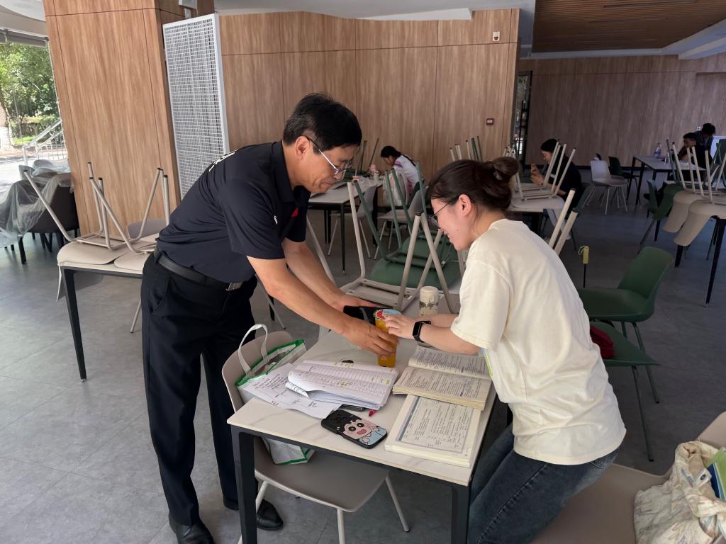 慰问期间李院长亲手为每一位备考学子送上了一份特别的“加油水”——一杯金灿灿的橙汁,被赋予了“心想事‘橙’”的璀璨寓意。李院长在发放橙汁时,特别阐释了这份礼物的心意:“这杯橙汁,寄托着学院对大家最美好的祝愿,‘橙’与‘成’同音,愿你们在考场上沉着应战,最终都能‘心想事橙’,金榜题名,成功上岸!”这份饱含美好祝福的“心想事橙”礼物,让学子们在紧张的备考之余,感受到了来自学院领导的浓浓温情与精神鼓舞。