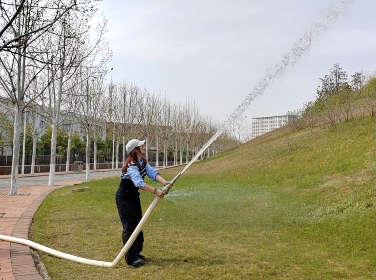 实操阶段设置器材使用与火情处置两大模块。徐处长现场演示二氧化碳灭火器、消防水带等器材操作规范,参训学生分组完成"灭火器精准喷射""消防水带快速连接"等专项训练。在模拟火场环境中,学生运用"提、拔、握、压"四步灭火法成功扑灭明火点。辅导员毛君安全程督导并表示:"实战化训练有效打通了知识传授向能力转化的通道。"