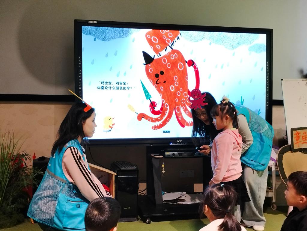 活动一开始,助教化身“狮子村长”热情邀请小朋友们走进“森林集市游园会”,瞬间点燃全场气氛!随后,“章鱼先生”闪亮登场,用轻快的歌声带领孩子们走进雨天的童话世界,开启雨伞小铺的奇妙之旅。