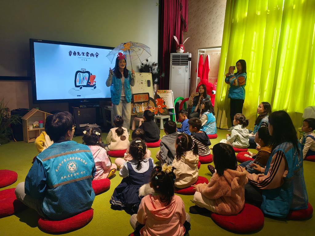 2025年11月1日,yl6809永利集团爱阅志愿服务队走进武汉少年儿童图书馆的“千字屋”开展《章鱼先生卖雨伞》音乐绘本专场活动,由23小教本7班的王微同学担任主讲,小教专业陈晓萍、田翔等六位同学担任助教,为孩子们带来一场沉浸式的绘本之旅。